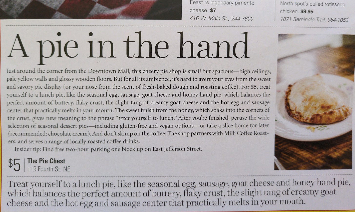 Food FeaturesArticles and press coverage of The Pie Chest goodiesRachel Nicole PenningtonOct 13, 20242Share(Cover feature and article from Edible Blue Ridge, posted with permission)(features from Knife & Fork magazine, Cville Weekly)